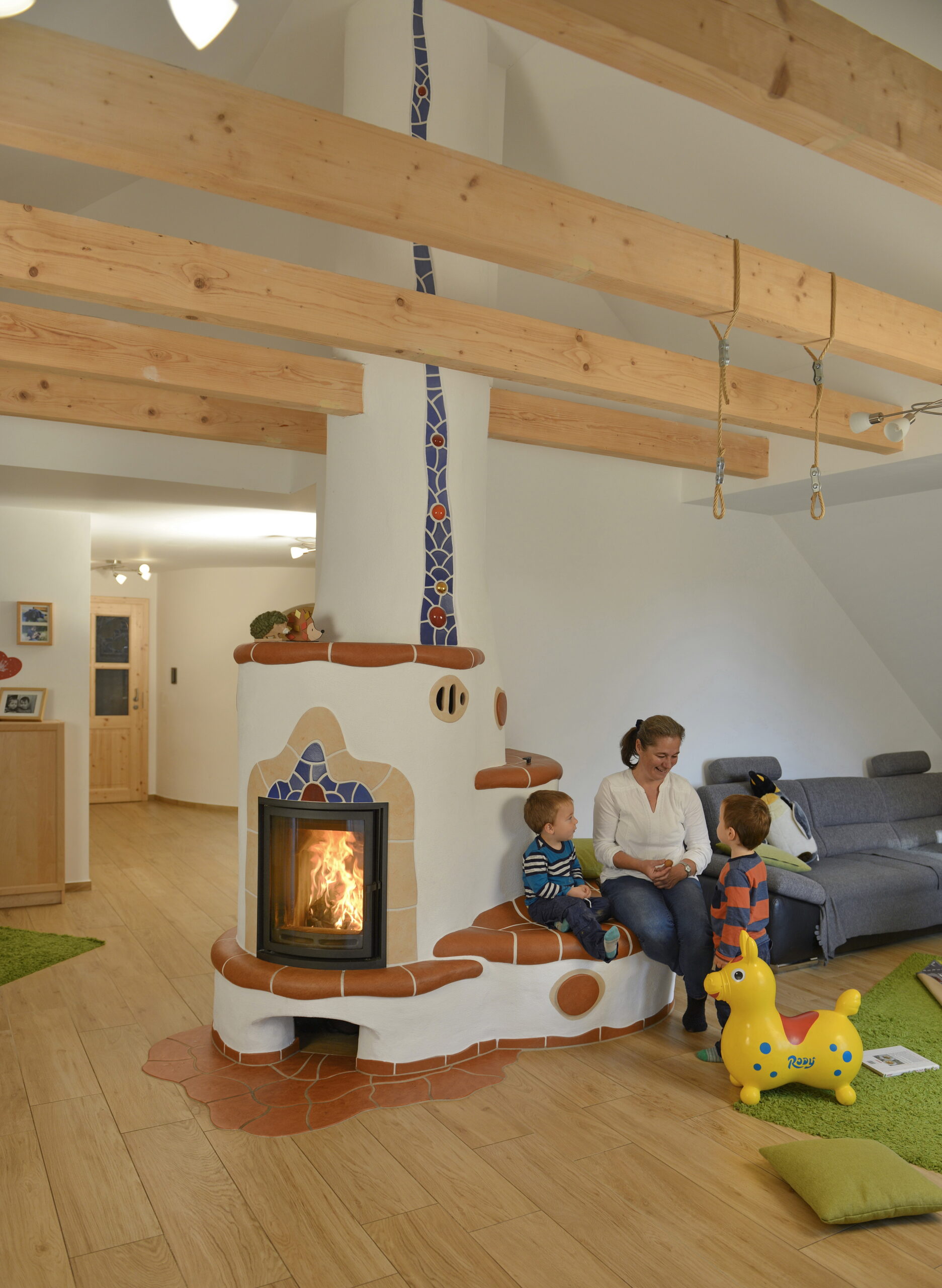 Die große Sitzbank und die Rückenlehne fungieren als Speicherblock und lassen den Ofen für viele Stunden die Wärme halten und in den Raum abstrahlen.